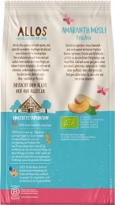 HAFERVOLLKORNFLOCKEN*, Rosinen* (13%), Amaranth* gepoppt (9%), getrocknetes Obst* (7%) (in veränderlichen Gewichtsanteilen: Datteln*, Apfelstücke*, Aprikosenstücke*), Reissirup*, HASELNÜSSE*, Rohrohrzucker*, Sonnenblumenöl*, Buchweizen*, SESAM*, MANDELN*, Inulin*, Reismehl*, Antioxidationsmittel: stark tocopherolhaltige Extrakte.| Energie | Fett | gesättigte Fettsäuren | Kohlenhydrate | Zucker | Ballaststoffe | Eiweiss | Salz |