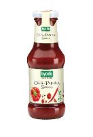 Saftige Paprika und feurige Chillies vereinen sich köstlich in der Byodo Chili-Paprika Sauce. Die vegane Feinkostsauce ist frei von Hefe und Gluten.