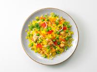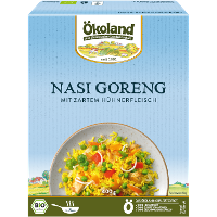 30% Reis* gegart (Wasser, Reis*, Speisesalz, Kurkuma*), 13% Hühnerfleisch* gegart, Mungobohnenkeime*, Erbsen*, Karotten*, Porree*,