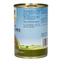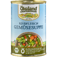 Trinkwasser, 26% Gemüse* - in veränderlichen Gewichtsanteilen (Karotten*, SELLERIE*, Erbsen*, Lauch*, Brechbohnen*), 9% Rindfleisch* gegart, Sonnenblumenöl*, Meersalz, Zuckerrübensirup*, Weinessig*, Traubensaftkonzentrat*, Maisstärke*, Gewürze* (Zwiebeln*, Muskat*, Curcuma*, Pfeffer*, Knoblauch*), Liebstöckel*.| Energie | Fett | gesättigte Fettsäuren | Kohlenhydrate | Zucker | Ballaststoffe | Eiweiss | Salz |