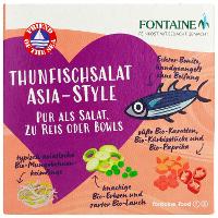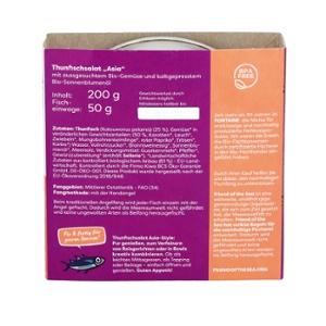 THUNFISCH (Katsuwonus pelamis)25%, Gemüse* (50%) - Karotten*, Lauch*, Zwiebeln*,Mungobohnenkeimlinge*, roter Paprika*,Erbsen*, Kürbis* in veränderlichen Gewichtsanteilen- Wasser, Vollrohrzucker*, Branntweinessig*,Sonnenblumenöl*, Meersalz, VerdickungsmittelGuarkernmehl* und Johannisbrotkernmehl*,Pfeffer*, Gewürzzubereitung* (enthält SELLERIE*).| Energie | Fett | gesättigte Fettsäuren | Kohlenhydrate | Zucker | Eiweiss | Salz |